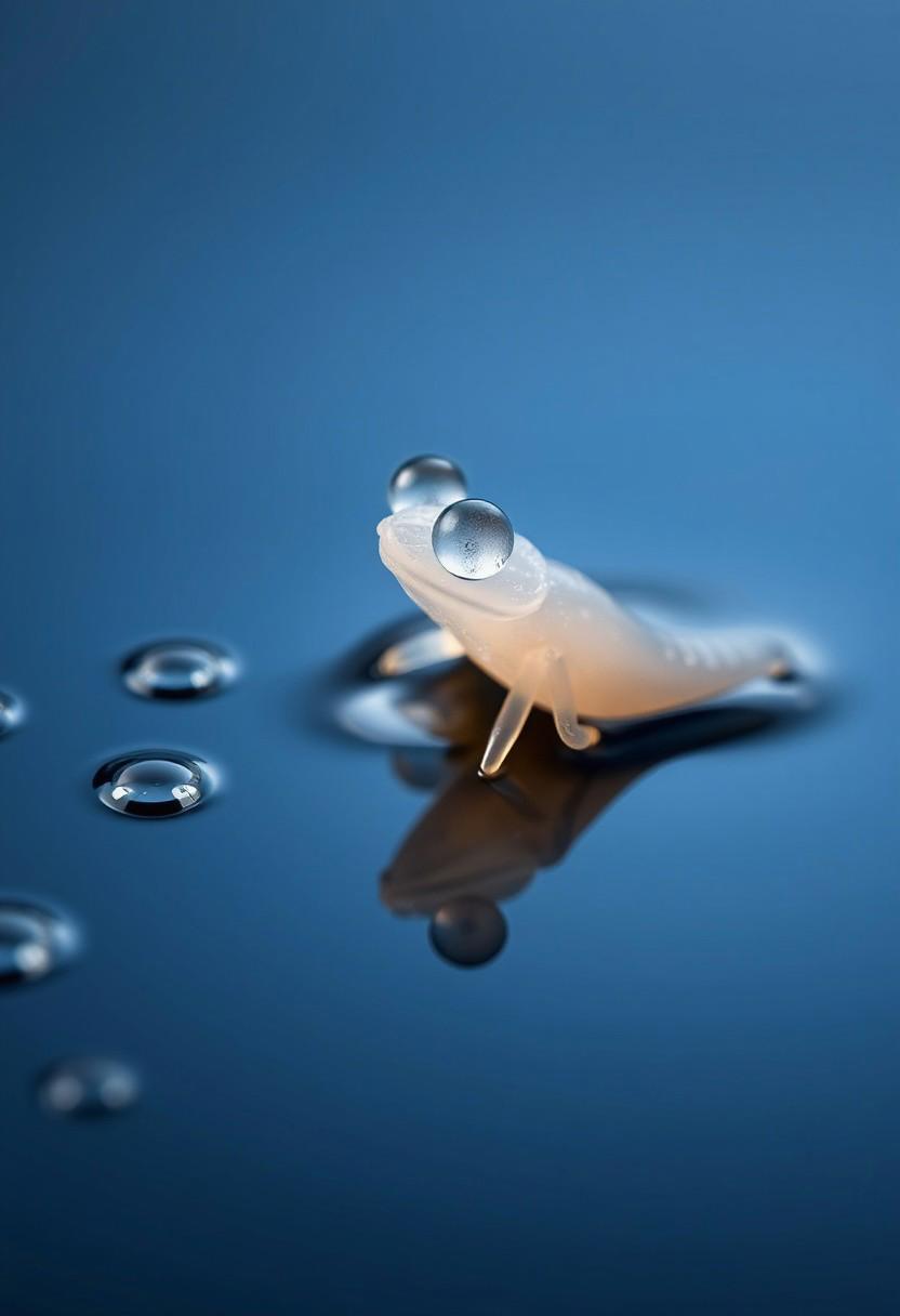 Macro photography of capturing the beauty of nature in a delicate and poetic way, hydroforming, Miki Asai Macro photography, close-up, hyper detailed, trending on artstation, fantastic Realism and Sharp Focus, studio photo, intricate details, highly detailed, Water Droplets on Dark Blue Surface Art, water, water reflection, Cute water creature, Each image is a glimpse into a serene and enchanting world