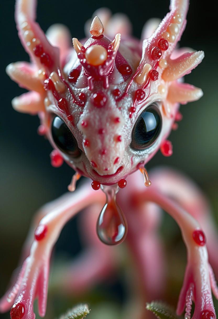 Cute creature from Space. terraforming. Alien Flora, Miki Asai Macro photography, close-up, Miki Asai’s visual style is ethereal and dreamlike, capturing the beauty of nature in a delicate and poetic way, hyper detailed, trending on artstation, fantastic Realism and Sharp Focus, studio photo, intricate details, highly detailed, by greg rutkowski detailed face, detailed skin, filigree red drops, Mysterious Filigree Elements, reflection