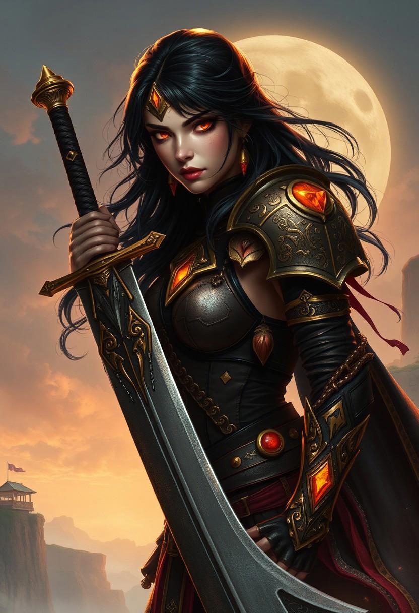 masterpiece, score_9, score_8_up, score_7_up, EasyNegative_v2, (best quality:1.1),ultra-detailed, high resolution, super detailed skin, beautiful detailed eyes, nsfw, Fantasy warrior woman with black hair, gold eyes, holding a big sword, adorned with gold painted with glowing runes and amber gems, wearing velvet armor rusted black matte metal, stands on a cliff above a cliff, colorful, , detailed skin, realistic ,,(lora:Ultima_Flux_v1:0,5)