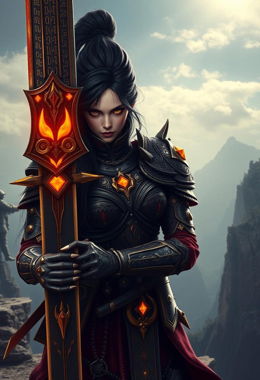 masterpiece, score_9, score_8_up, score_7_up, EasyNegative_v2, (best quality:1.1),ultra-detailed, high resolution, super detailed skin, beautiful detailed eyes, nsfw, Fantasy warrior woman with black hair, gold eyes, holding a big sword, adorned with gold painted with glowing runes and amber gems, wearing velvet armor rusted black matte metal, stands on a cliff above a cliff, colorful, , detailed skin, realistic ,,(lora:Ultima_Flux_v1:0,5)