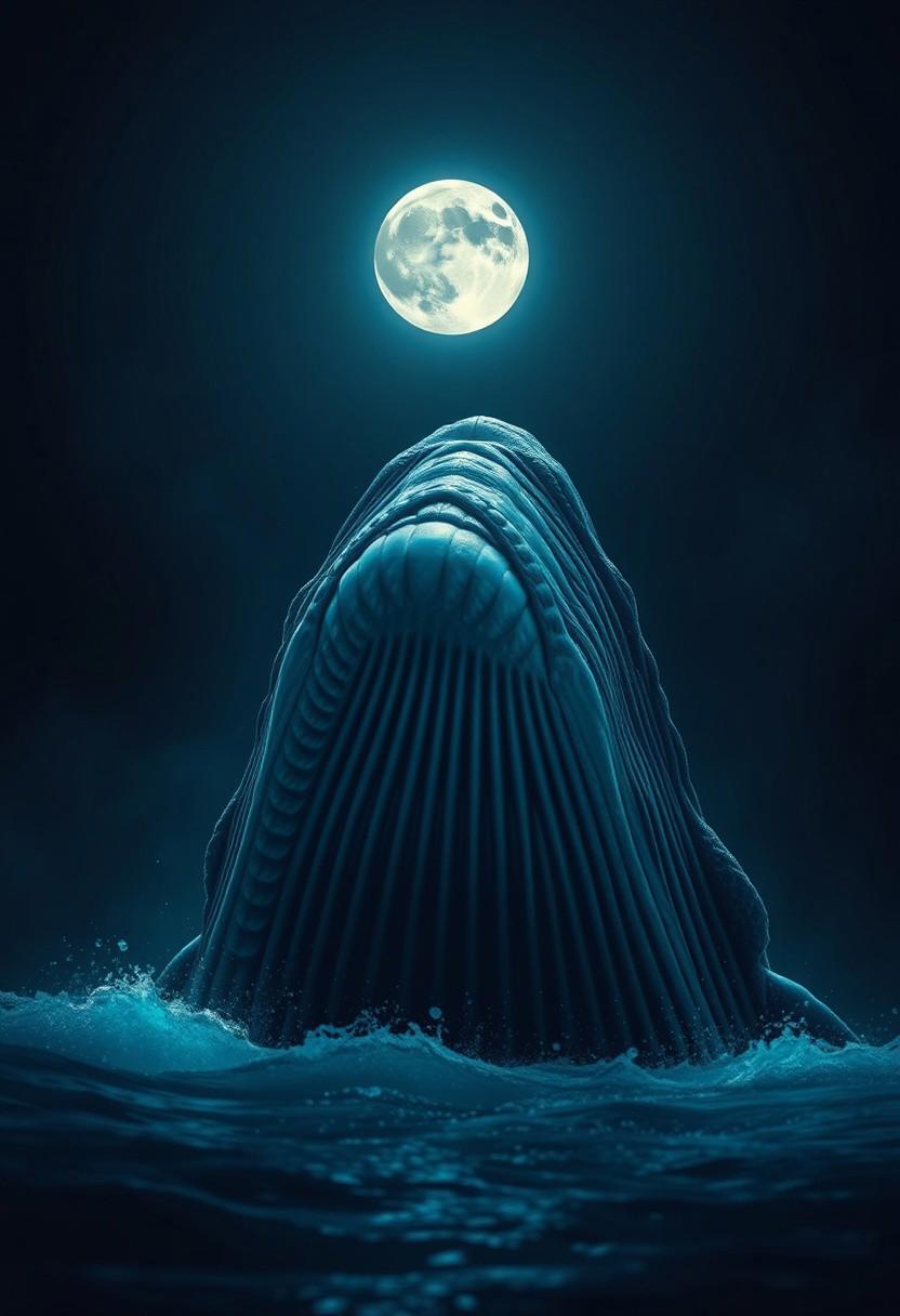 big blue whale Opening his mouth to eat the moon in the sky at deep dark night, close-up, hyper detailed, fantastic Realism and Sharp Focus, intricate details, highly detailed, Each image is a glimpse into a serene and enchanting world, cinematic lighting, glowing