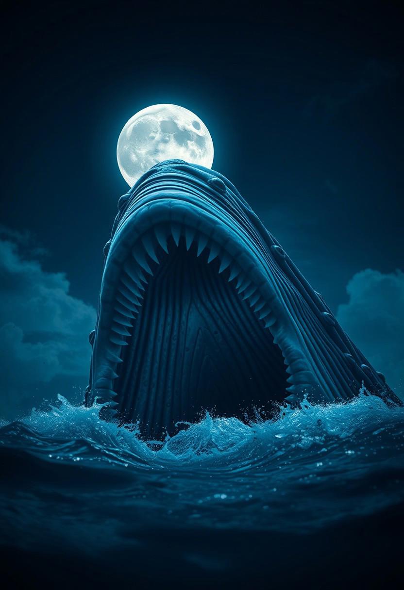 big blue whale Opening his mouth to eat the moon in the sky at deep dark night, close-up, hyper detailed, fantastic Realism and Sharp Focus, intricate details, highly detailed, Each image is a glimpse into a serene and enchanting world, cinematic lighting, glowing