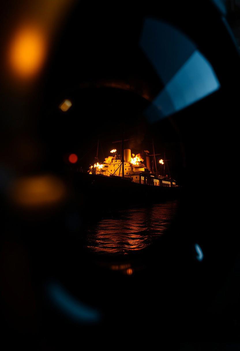 Fantastic visualization. Side view of the surface of an expensive lenses of a periscope sinking burning large merchant ship from ww2 era visible in it's reflections. Side view. Fantastic visualization. Lenses cover the entire frame. A masterpiece. Night. Extremely detailed.