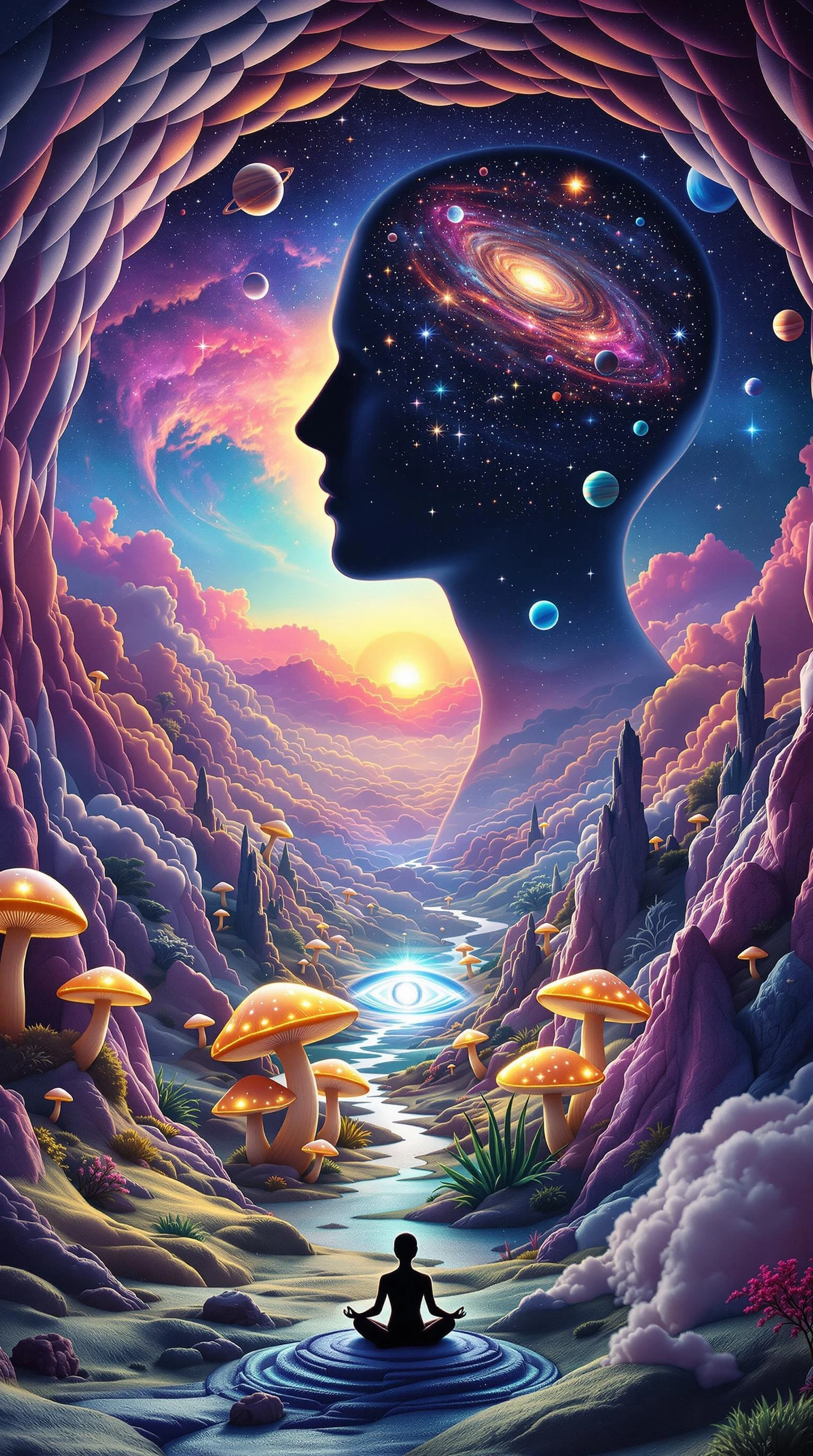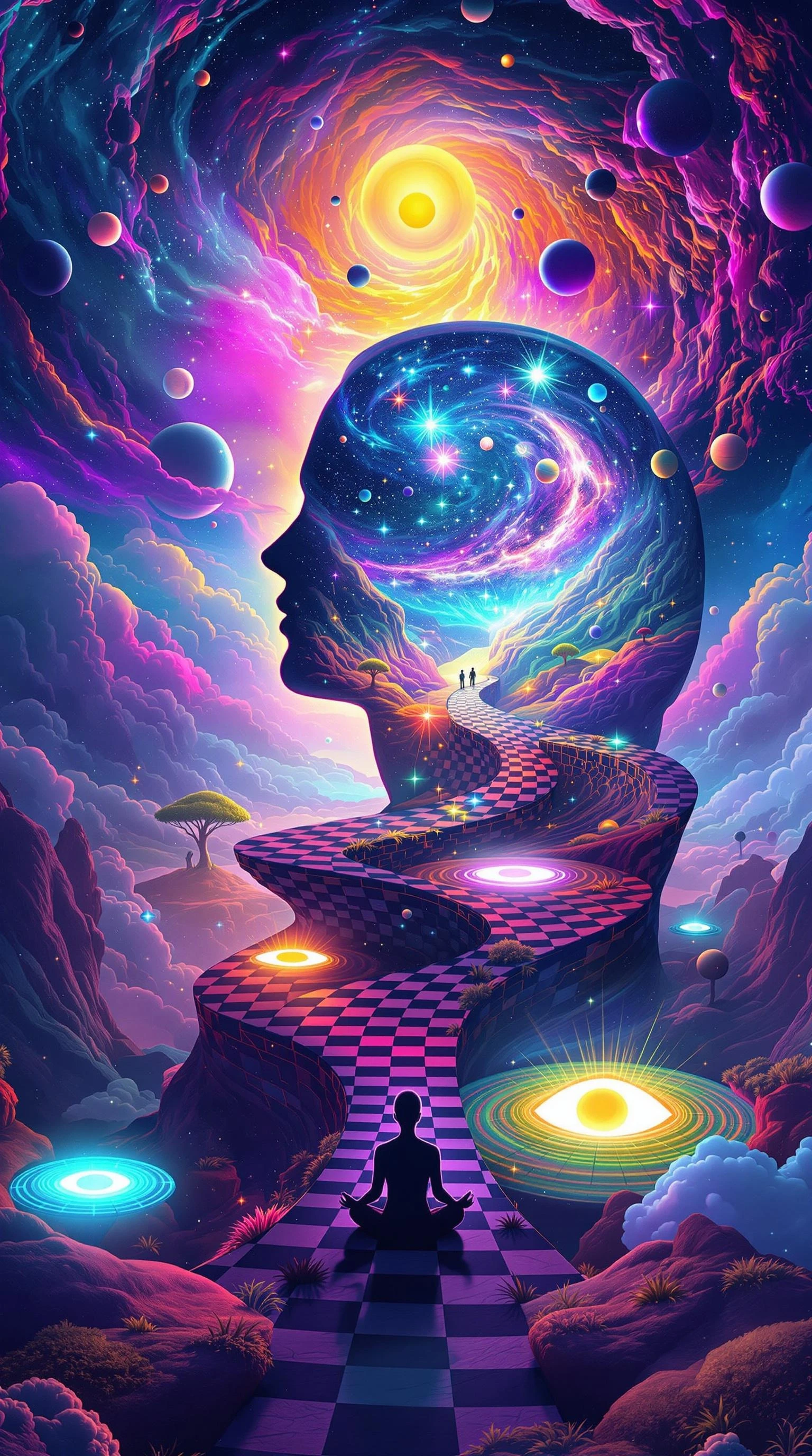 Create a surreal 3D scene that merges cosmic introspection, alien mysticism, and vibrant, dreamlike landscapes. In the foreground, the profile of a silhouetted human head is filled with a galaxy, stars, and planets, representing an expansive inner universe. Surrounding the head is a warped, checkerboard tunnel that bends reality, drawing the viewer deeper into this alternate dimension. In the middle ground, an alien landscape unfolds with glowing, oversized mushrooms and extraterrestrial beings – one seated meditatively, and another standing by an eye-shaped portal bathed in neon light. The background opens into a sprawling, colorful cosmic horizon where clouds form waves around planets and stars, leading to a radiant, sun-like celestial body that illuminates the scene. Use intense, psychedelic colors, intricate textures, and surreal lighting effects to convey a sense of boundless exploration, as if inviting the viewer to journey through layers of consciousness, otherworldly realms, and cosmic vistas