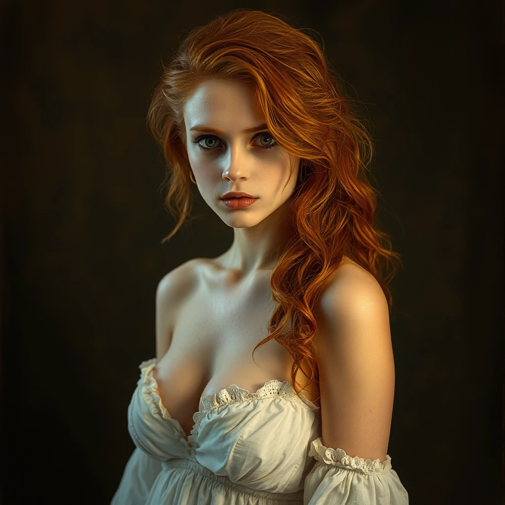 Classical oil painting in Impressionism style,, standing alone in a dark room, fine art painting, piercing dark gray eyes , exaggerated anatomy, intricate details in her hair and clothing, warm lighting, surrounded by a softly blurred, dark patina background. Rich golden hues contrast with deep shadows, reminiscent of Baroque masters , Awe inspiring , stunning visuals, intricate details, Rembrandt scheme lighting, sunlight , global illumination, hdr, Shot Photography by Ellen von Unwerth and Wes Anderson and Jimmy Nelson, Lana del Rey summertime sadness, spicy nightdress in white, minimal coverage showing a lot of skin, Provocative V-neckline, intricate background, captivating, provocative pose, exaggerated anatomy , flowing ginger hair, provocative