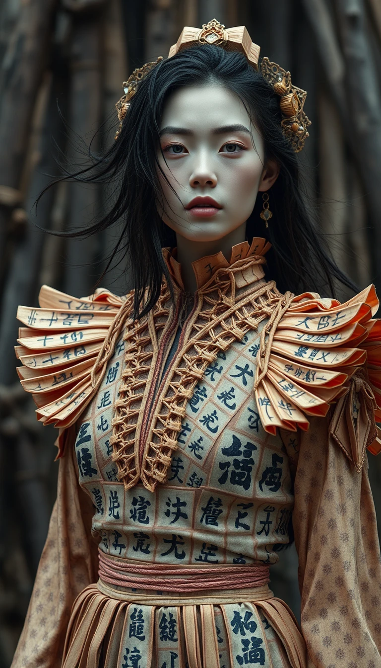 Shot on: Red Epic Mysterium X Lens: Sigma 18-35 mm Sonja Frigg Gunnarsdottir Björk in Sashimono wood joint inspired dress design, professional photography style mixed with digital concept art by Yoji Shinkawa and Masamune Shirow. Ultra high definition. detailed specifics. sharp focus on very intricate and beautiful brimming upper body outfit of excellent quality. Experimental abstract art. Wild dynamic pose with a lot of energy. Kanji calligraphy flowing high contrast ink style,