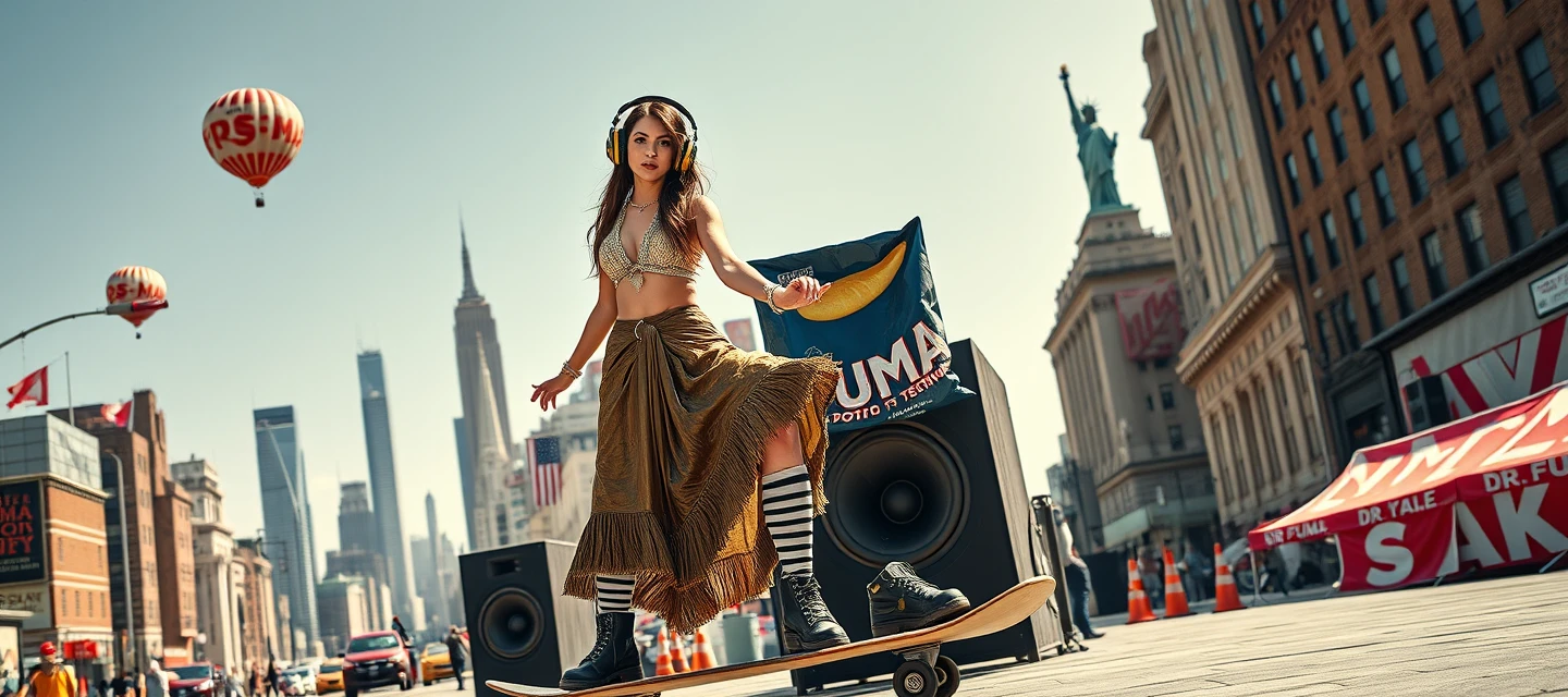 A glamorous woman with fair and shiny skin and long hair. She is wearing silk distressed lehnga, with text "DRFUMA REMIX". She is wearing lots of jewelry. She's wearing huge headphones with text "FUMA". She is performing on a skateboard, besides huge chips bag with text "FUMA Potato Techno", wearing stripes long socks, and big boots with text "DRFUMA". She is looking at the camera. The scene is set in new york city wall street, sunny day, big speakers, skyline, buildings. a damaged signboard in the background that reads "DrFUMA in New York City". Hot air steampunk balloons flying. Statue of liberty is seen far away.