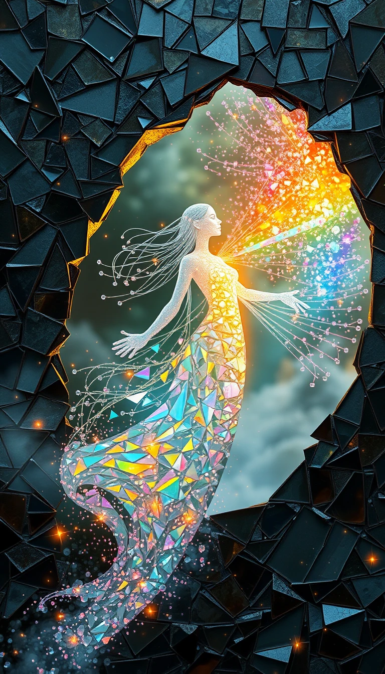 Super detailed high-quality 8K A mesmerizing abstract mosaic crafted entirely from fractured pieces of stained glass, polished gemstones, and reflective metals. The scene depicts a serene forest spirit emerging from a radiant portal. The spirit's ethereal form is composed of hundreds of tiny, glowing shards, seamlessly blended to create the appearance of flowing movement. Her translucent body refracts the light, forming intricate rainbow patterns across the scene. Surrounding her, the abstract portal pulses with energy, its edges dissolving into cascading fragments. The environment is minimalistic yet rich in texture, with a faint mist and glowing particles adding depth and mystique. The interplay of light, color, and texture creates a sense of wonder and timeless beauty.