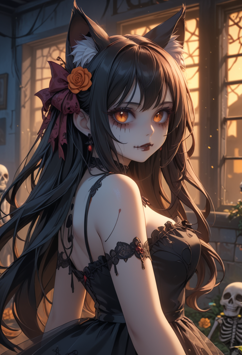 score_9, score_8_up, score_7_up, score_6_up, dynamic, (anime, masterpiece), best quality, (8k), detailed background, sharp focus, intricate, ambient lighting, super high quality, hyper detailed background, cinematic lighting, adult, double tone long hair, mature, Day of the Dead, embedding:zPDXLxxx, spooky, cat ears, dress, posing, abandoned house, addDetailXl.MLUV, Nyaomi<lora:Nyaomi.safetensors:1.0:1.0> <lora:addDetailXl.MLUV.safetensors:1.0:1.0>