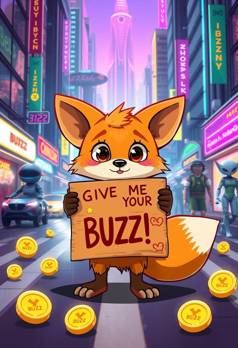 A cute, cartoon-style character—a quirky, wide-eyed, and slightly scruffy fox—stands in the middle of a bustling, futuristic city street. The fox, with its soft orange fur and oversized ears, holds a brightly colored cardboard sign that reads: "GIVE ME YOUR BUZZ! 🙏✨" in big, playful letters. The sign is adorned with glittering, golden sparkles, as if the word "BUZZ" is radiating a magical glow. The fox’s expression is both earnest and charming, with a slightly exaggerated pout and a hopeful, puppy-dog gaze that tugs at the heartstrings. Around the fox’s feet are floating digital coins marked with the word "BUZZ," which occasionally flicker as if they're about to be donated. In the background, a neon-lit skyline shimmers, and hovercars zoom past, creating a vibrant, sci-fi atmosphere. A few other fantastical creatures—robots, aliens, and humanoid animals—are seen passing by, eyeing the fox’s sign curiously, some with amused smiles. The scene feels playful and lighthearted, yet the fox’s determined pose and pleading eyes add a funny, endearing touch. The overall tone of the image is whimsical, inviting, and cleverly self-aware, blending humor with a touch of cute desperation. It’s the perfect blend of adorable, witty, and shareable—designed to make people smile and want to donate their BUZZ to this little fox in need.