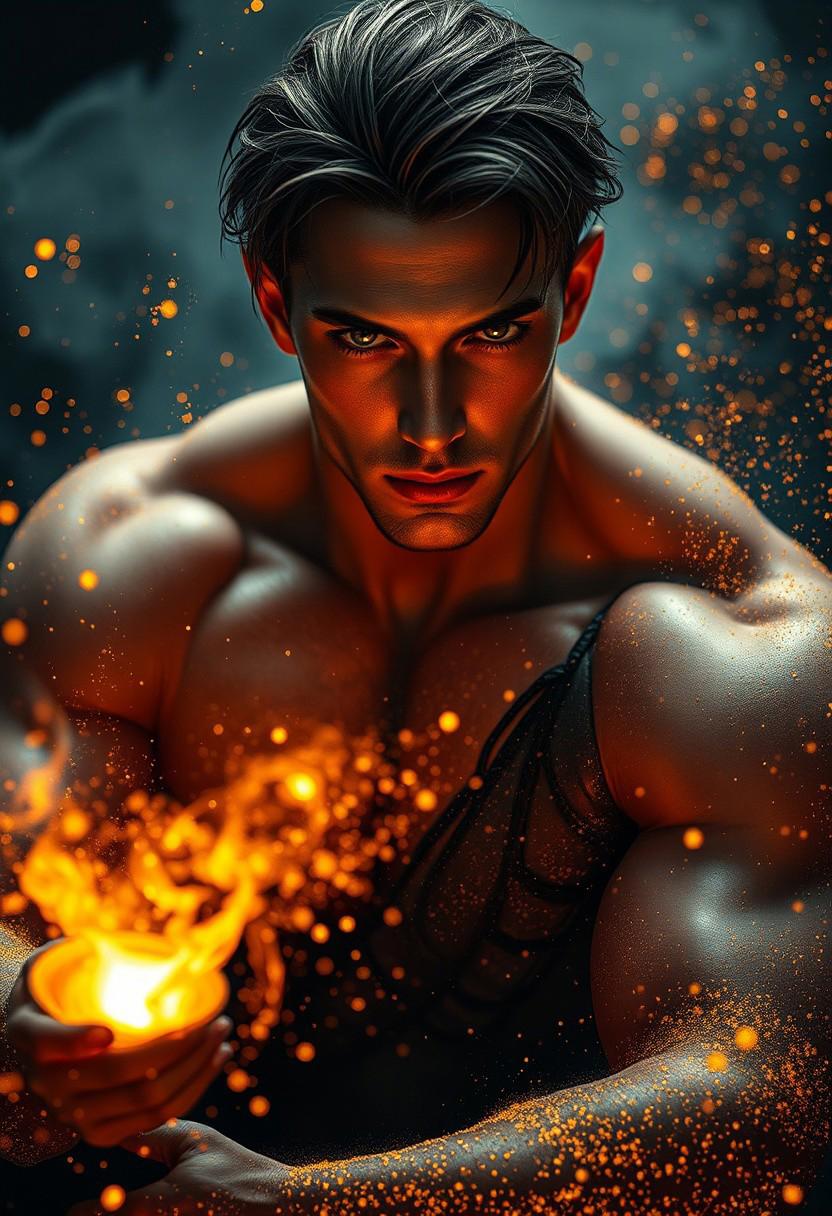 (Create in dark fantasy theme style) A beautiful, very muscular male (((Witcher))),((Witcher costium:3)),beautiful eyes,pale lips,fairycore,hkmagic,reflected,dynamic pose,dust and debris around his made of gold and fire,glowing light particles and sparkles in the style of glitter and diamond dust,hyper-realistic fire,fogy,donghua theme,highly detailed,sharp focus,dynamic lighting,perfec proportions (perfect Sensualy,Ethereal,Intimate),No weird body proportions,(Reasonable body proportions(skin texture)(photo-realistic natural skin tone)(high-definition skin)(professional photograph),(high-definition photo),photography,(highres,absurdres:1.4),(super detail:2),(best quality:2),high-detailed,Intricate Complex contrast,Sharp,soft Cinematic Volumetric lighting,official style,depth of field,perfect masterpiece,(Masterpiece:2),((unique view:2)),photorealistic:2),32K,UHD,this image is a masterpiece of photo digital art, perfect for a themed phone wallpaper