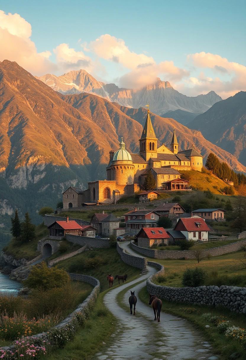 ultra realism, photorealistic image with high quality 8k and above, stable focus on an extremely breathtaking natural landscape of an ancient Christian fortress built on a hill and at the foot of it, there is a village with stone houses, mountains, lakes, boats, waterfalls, castle, ruins, fortress, Catholic ancient Cathedral, castle, village, flower meadows, rocks, wild forest animals, horses, pasture, river, color balance, golden hour, protective wall around the village, road
