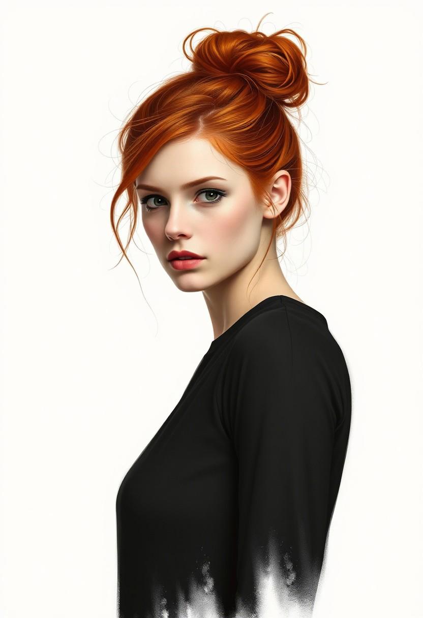 A 30yo woman with ginger hair in a messy updo, Slender body, serious expression, a hint of evil, piercing eyes, seductive, charming woman, charmful looking, captivating, minimalist, slender frame, detailed, designer clothes, painterly , style of tom whalen