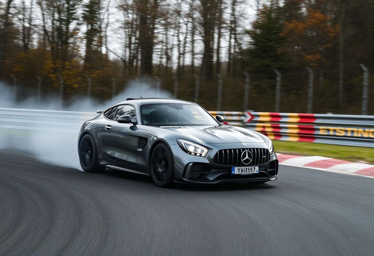 AMG Mercedes is drifting around a corner at the Nürburgring race track.