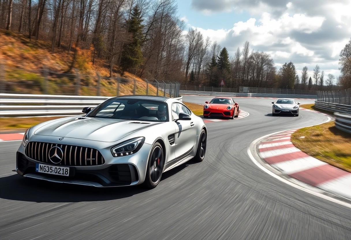 AMG Mercedes is drifting around a corner at the Nürburgring race track. The camera has a wiede angle, so we are able to see a great section of the race track. There are other cars. Porsche 911, Lamborghini and Ferrari. It is a very exciting race.
