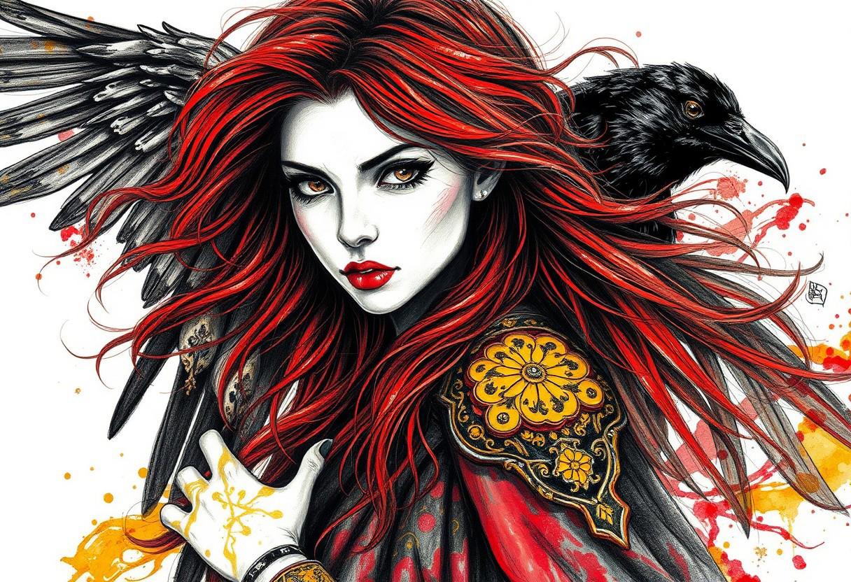A full-body, hyper-textured pencil and charcoal cross-hatched sketch rendered in mixed media, with rich blacks, Indian yellow, and blood-red hues blending into ornate details. The central figure is a powerful and realistic woman with flowing reddish-black hair and intense dark eyes, a large raven perched on her left shoulder with its wings folded back. This black-and-white sketch features intricate details against a clean white background. Designed as a high-resolution (8k) matte painting with a fantastical atmosphere, this piece is ideal for splash screens and fantasy concept art. Complementary colors create striking contrasts within the intricate details, embodying a style that echoes the work of Aaron Horkey and Lee Bogle, with the refined brushstrokes reminiscent of Louis Marie de Schryver and Jacob van Ruisdael.