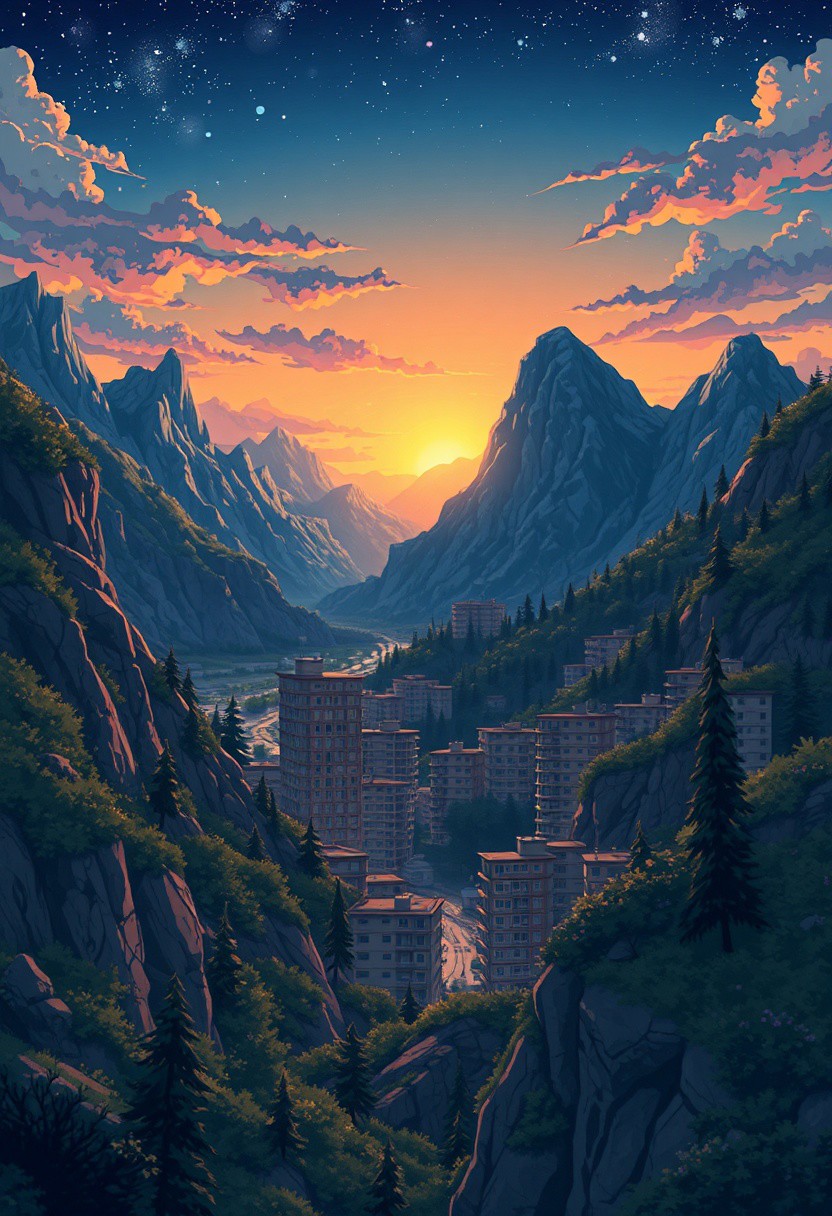 2D cartoon in retro anime style, surrealism and fantasy, picturesque wilderness nature, night, stunning landscape of a city built on mountainous terrain, apartment buildings, old anime, sunrise,