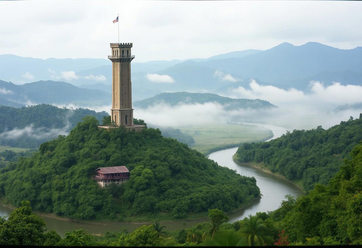 hyoer realistic 35mm film art photo of a looming gothic watchtower looming over the landscape, A tranquil scene of the lush hills and valleys of the Cayo District, Belize, with winding rivers and vibrant flora, The scene is set during the early morning, with mist hovering over the landscape, The atmosphere is peaceful and reflective, inviting admiration for the beauty of nature,