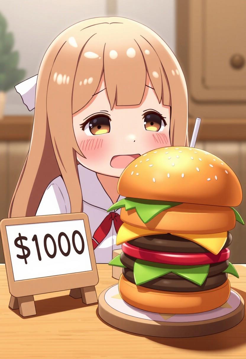 3d, 3d graphics, Bocchi, Hitori Gotou, anime girl (bocchi) looks at the burger with teary blank eyes, board with text: "$1000" next to the burger