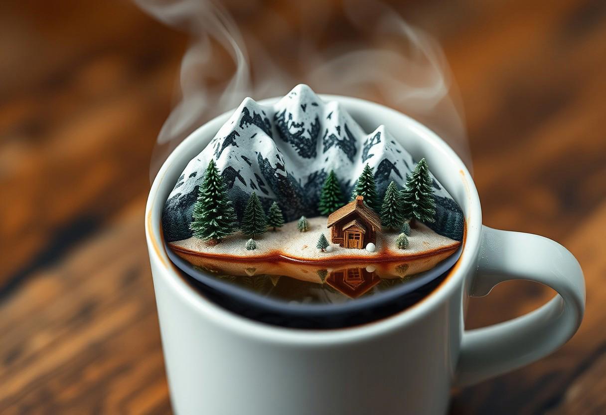A steaming coffee mug with a miniature mountain range inside, featuring snow-capped peaks, evergreen trees, and a tiny log cabin with smoke drifting from the chimney. The surface of the coffee is transformed into a serene lake reflecting the mountains, creating a cozy, surreal landscape, aidmaMJ6.1, aidmafluxpro1.1, in the style of Jed-clrfl