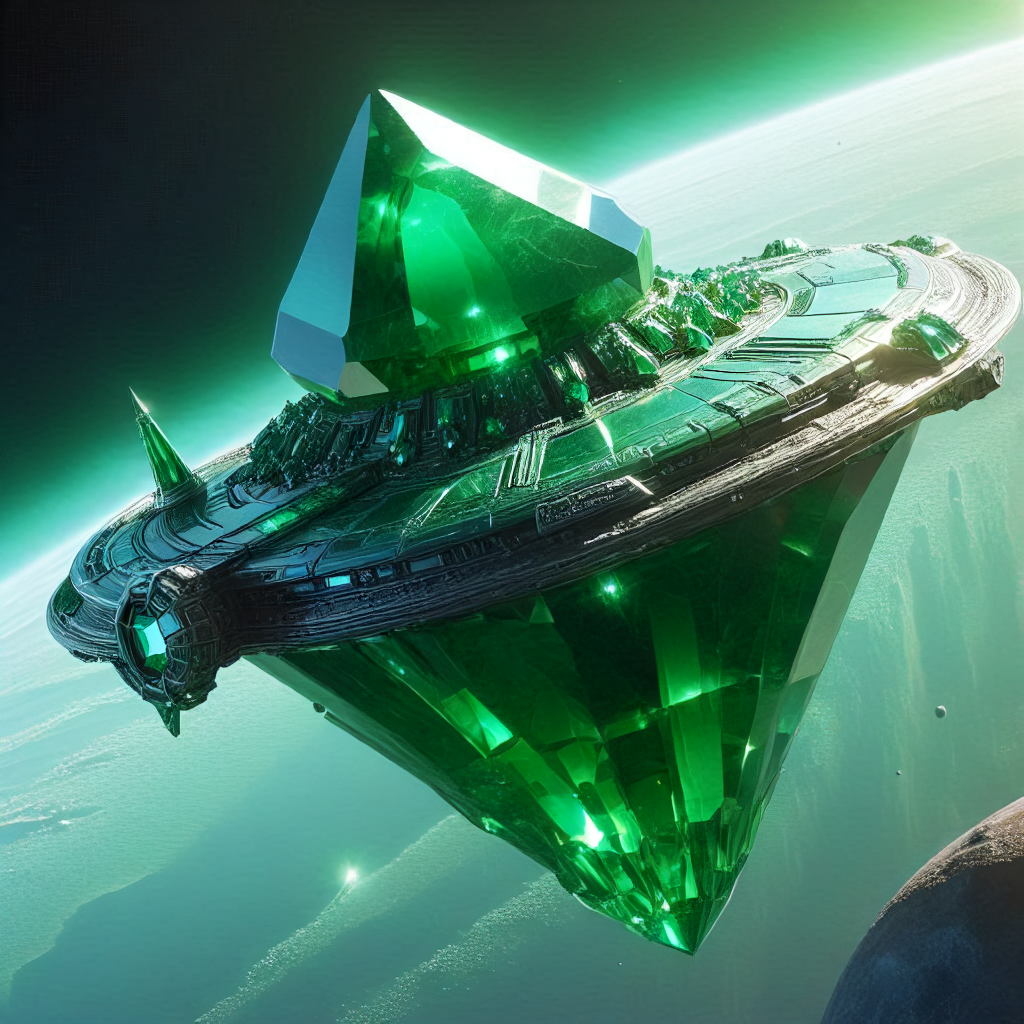 <lora:EmeraldMorph:1>, emeraldmorph, a huge angular alien spacecraft in orbit around a strange planet, the ship is made entirely out of emerald and gleams with light of the nearby star,