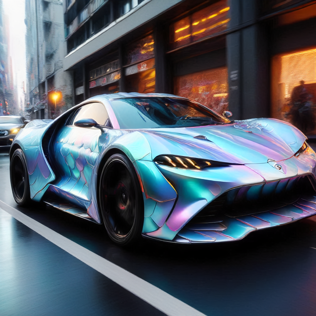 <lora:PinkieIriSclsSDXL:1>, p1nk1r1sc4l3s, a futuristic sports car covered in ridescent scales, driving through a high-tech city,