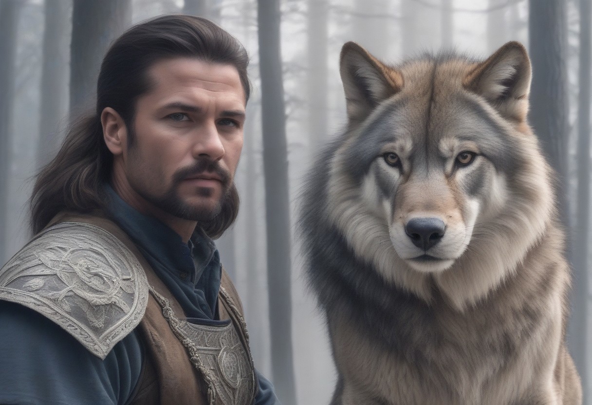A masterpiece, a picture of a man about 47 years old with wheat-brown hair, slightly dark beige skin, blue and white clothes with a silver sword in his hand, standing next to him is a beautiful gray she-wolf, both looking at the camera, ultra quality, excellent resolution, the man is wearing shiny gray pants, on his arm is a lion tattoo and a wolf tattoo, these two are standing at the beginning of a scary but natural forest