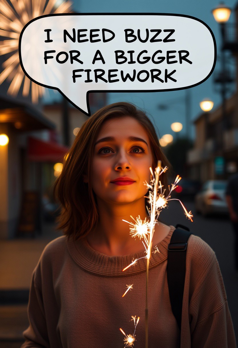25 years old female, lightning small crackers, speak bubble above her head that says "I NEED BUZZ FOR A BIGGER FIREWORK", street, small fireworks,