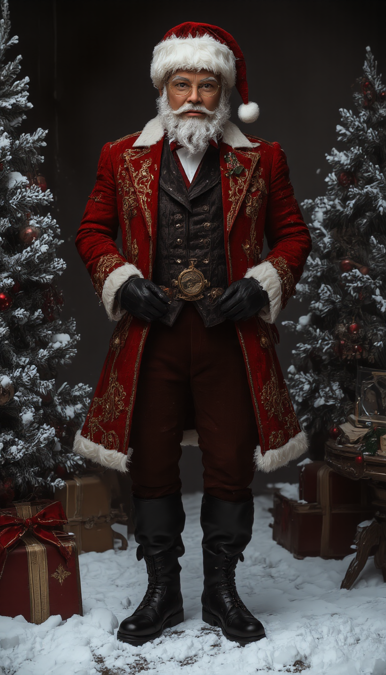 Realistic image reimagines a tall Santa Claus with a fashionable Victorian aesthetic. He dons an elegantly tailored deep red frock coat with intricate gold embroidery, a luxurious fur-lined collar, and polished leather boots. His fancy moustache is carefully groomed, paired with round, vintage spectacles. A velvet waistcoat and pocket watch add a refined touch, while snowy flakes swirl around him, enhancing the nostalgic yet stylish, aristocratic vibe. His confident, dignified pose exudes timeless charm, vantablack