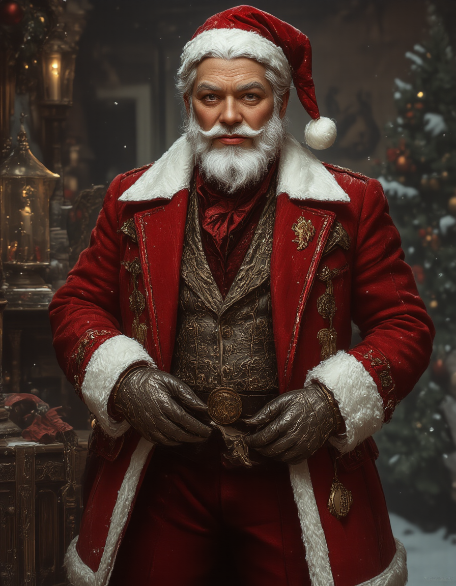 Realistic image reimagines a tall Santa Claus with a fashionable Victorian aesthetic. He dons an elegantly tailored deep red frock coat with intricate gold embroidery, a luxurious fur-lined collar, and polished leather boots. His fancy moustache is carefully groomed, paired with round, vintage spectacles. A velvet waistcoat and pocket watch add a refined touch, while snowy flakes swirl around him, enhancing the nostalgic yet stylish, aristocratic vibe. His confident, dignified pose exudes timeless charm, vantablack