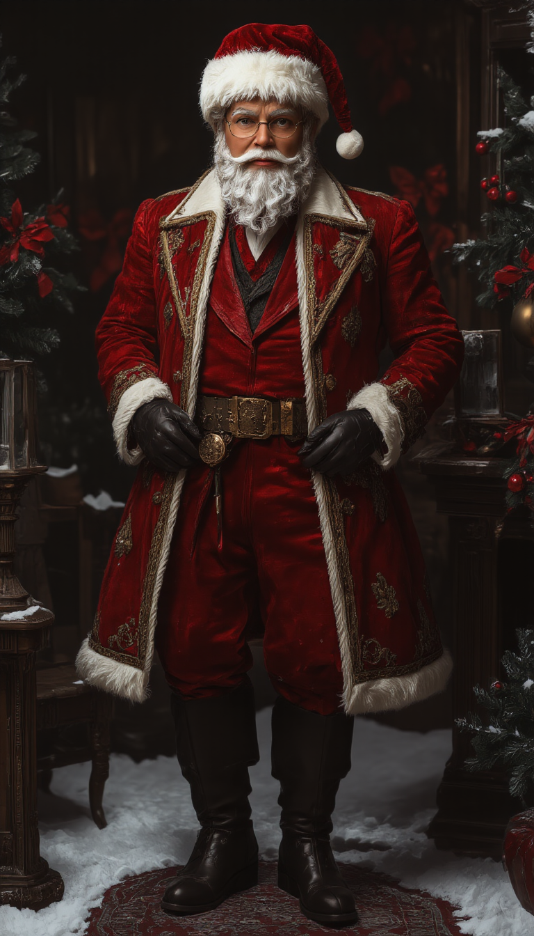 Realistic image reimagines a tall Santa Claus with a fashionable Victorian aesthetic. He dons an elegantly tailored deep red frock coat with intricate gold embroidery, a luxurious fur-lined collar, and polished leather boots. His fancy moustache is carefully groomed, paired with round, vintage spectacles. A velvet waistcoat and pocket watch add a refined touch, while snowy flakes swirl around him, enhancing the nostalgic yet stylish, aristocratic vibe. His confident, dignified pose exudes timeless charm, vantablack
