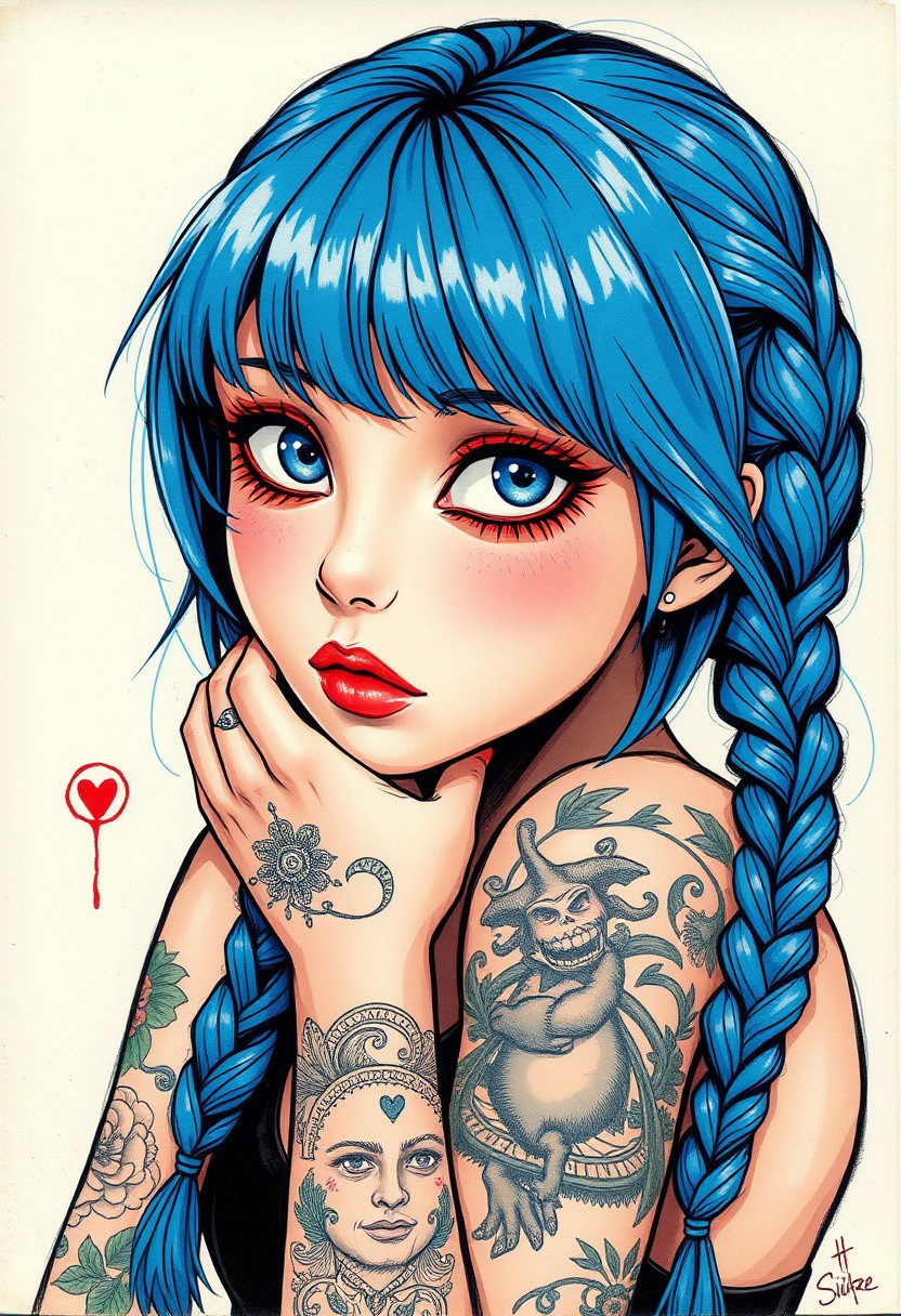 Art by Squeeze Dinger, perfect blue girl, Blue hair, Braids, big blue eyes, gorgeous tattoos, Ralph Steadman