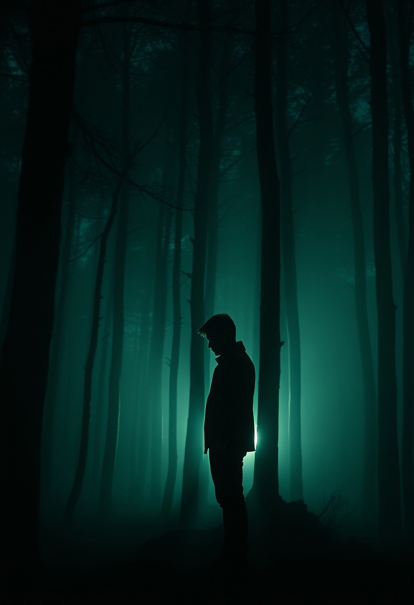 A melancholic forest twilight, bathed in a hauntingly beautiful ambiance. The camera lingers on a lone figure, shrouded in an atmospheric haze, as the trees' silhouettes pierce through the darkness. Faded greens and deep blues dominate the palette, punctuated by unusual dark colors that seem to absorb the light. Cinematic lighting casts long shadows, evoking a sense of foreboding. The subject's pose is contemplative, lost in thought amidst the mystical silence. Film grain texture adds an air of realism, as if this were a frame from a masterful cinematic production.