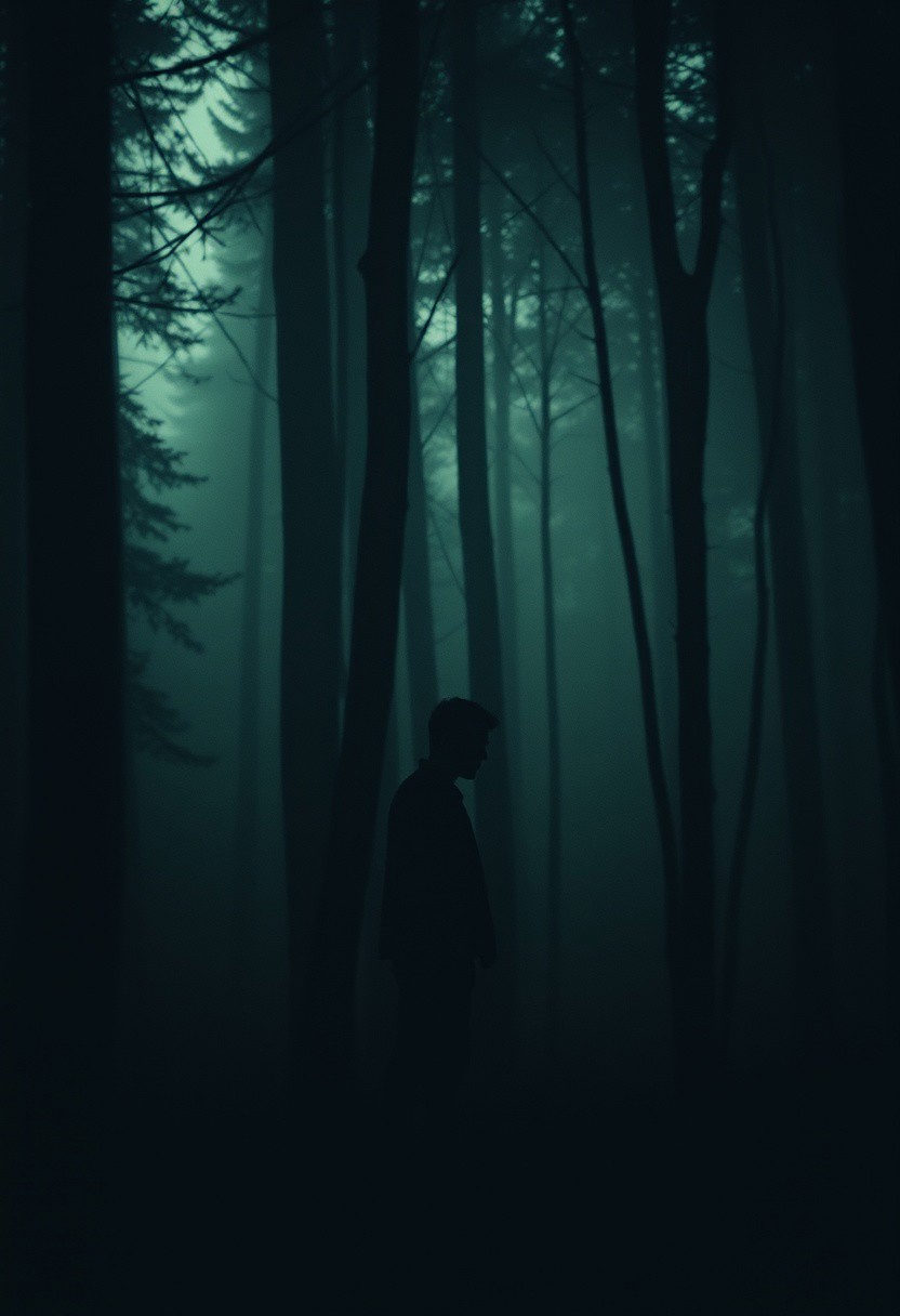 A melancholic forest twilight, bathed in a hauntingly beautiful ambiance. The camera lingers on a lone figure, shrouded in an atmospheric haze, as the trees' silhouettes pierce through the darkness. Faded greens and deep blues dominate the palette, punctuated by unusual dark colors that seem to absorb the light. Cinematic lighting casts long shadows, evoking a sense of foreboding. The subject's pose is contemplative, lost in thought amidst the mystical silence. Film grain texture adds an air of realism, as if this were a frame from a masterful cinematic production.