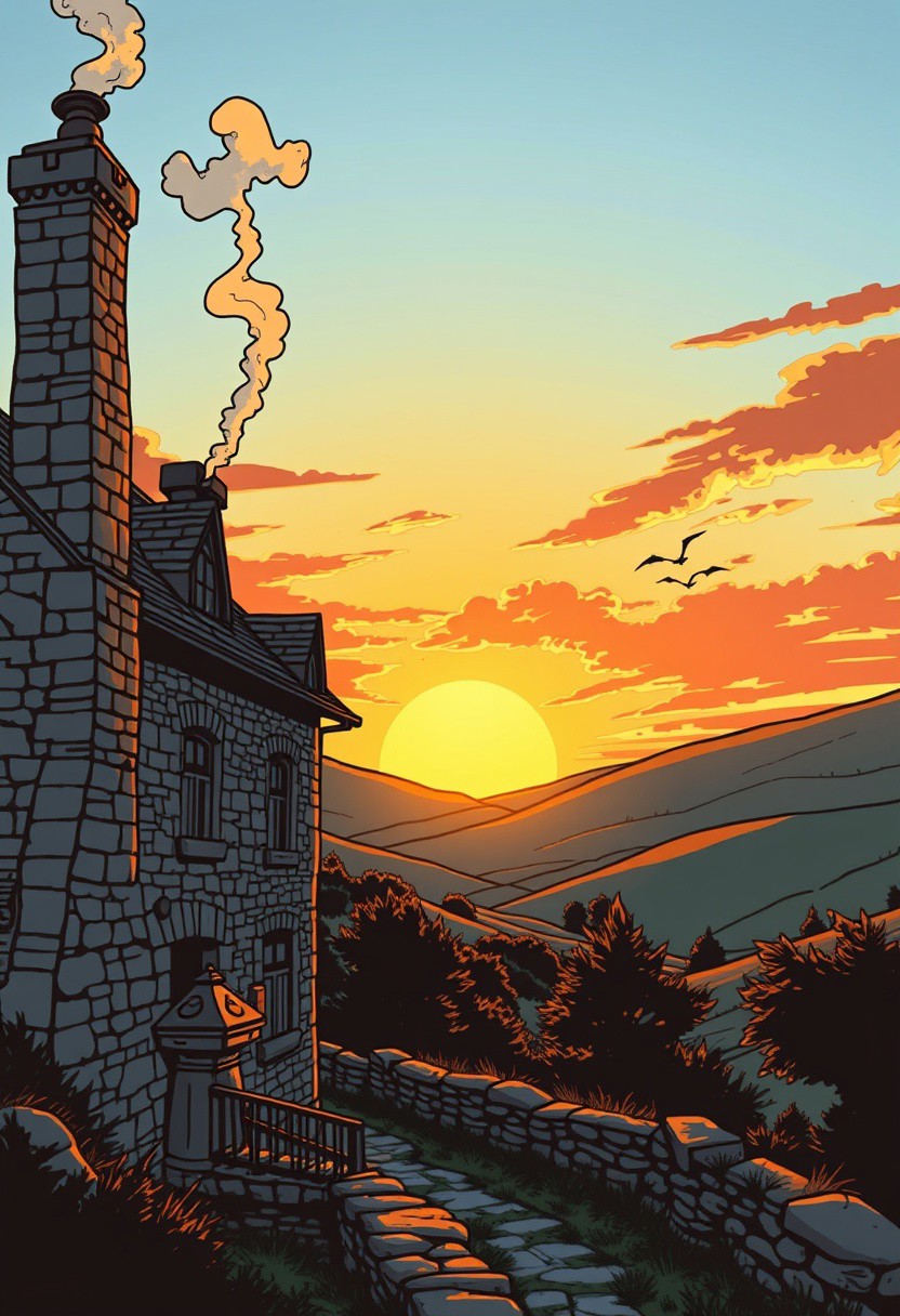 sunrise over a medieval stone inn, smoke from the chimney, rolling hills, in the style of a comic book
