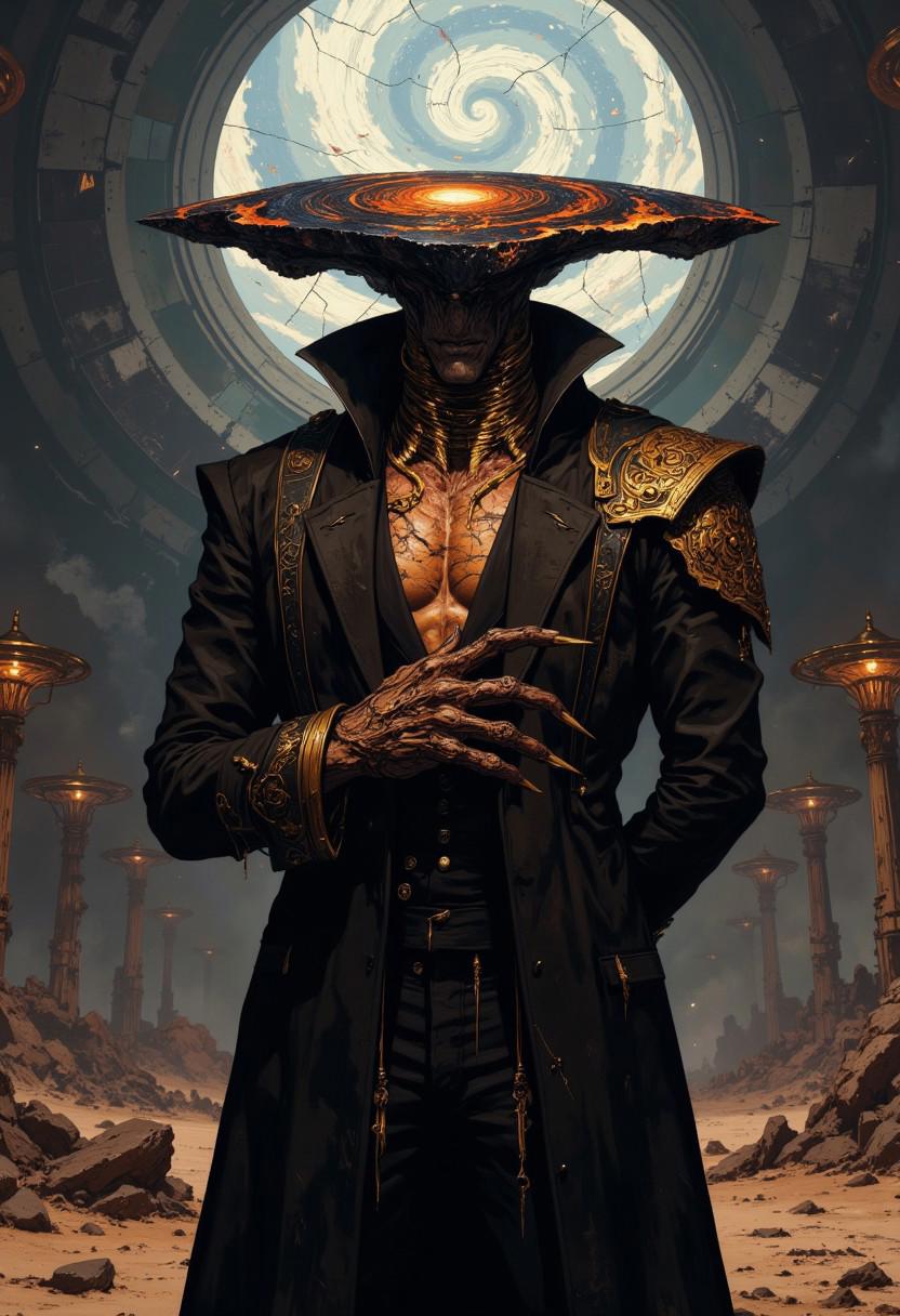 Subject: A humanoid whose upper torso is human-like, with copper-colored skin marked by spiraling scars that glow faintly as though magma flows beneath. Their head is replaced by a smooth, floating shard of obsidian that reflects the dim light, giving glimpses of unsettling scenes: fields of writhing hands, screaming faces, and barren landscapes. Around their neck hangs a jagged collar of golden blades, each engraved with alien symbols. Their attire is a fitted Baroque frock coat, its texture appearing to shift like liquid mercury. Their exposed hands end in long, claw-like nails that glimmer like polished onyx. Pose: Standing rigid, both arms crossed behind their back as though surveying unseen subordinates. Their chest is slightly puffed, exuding confidence and menace. Lighting: A dim, flickering light akin to a dying flame highlights the edges of their form, creating high contrast and throwing jagged shadows across the floor. Background: A barren wasteland enclosed within a cracked dome of glass, with faint glimpses of a decaying galaxy spiraling above. Ruined obelisks dot the landscape, their tops spinning unnaturally in midair. Cinematic anime, film, bokeh, professional, 4k, highly detailed.