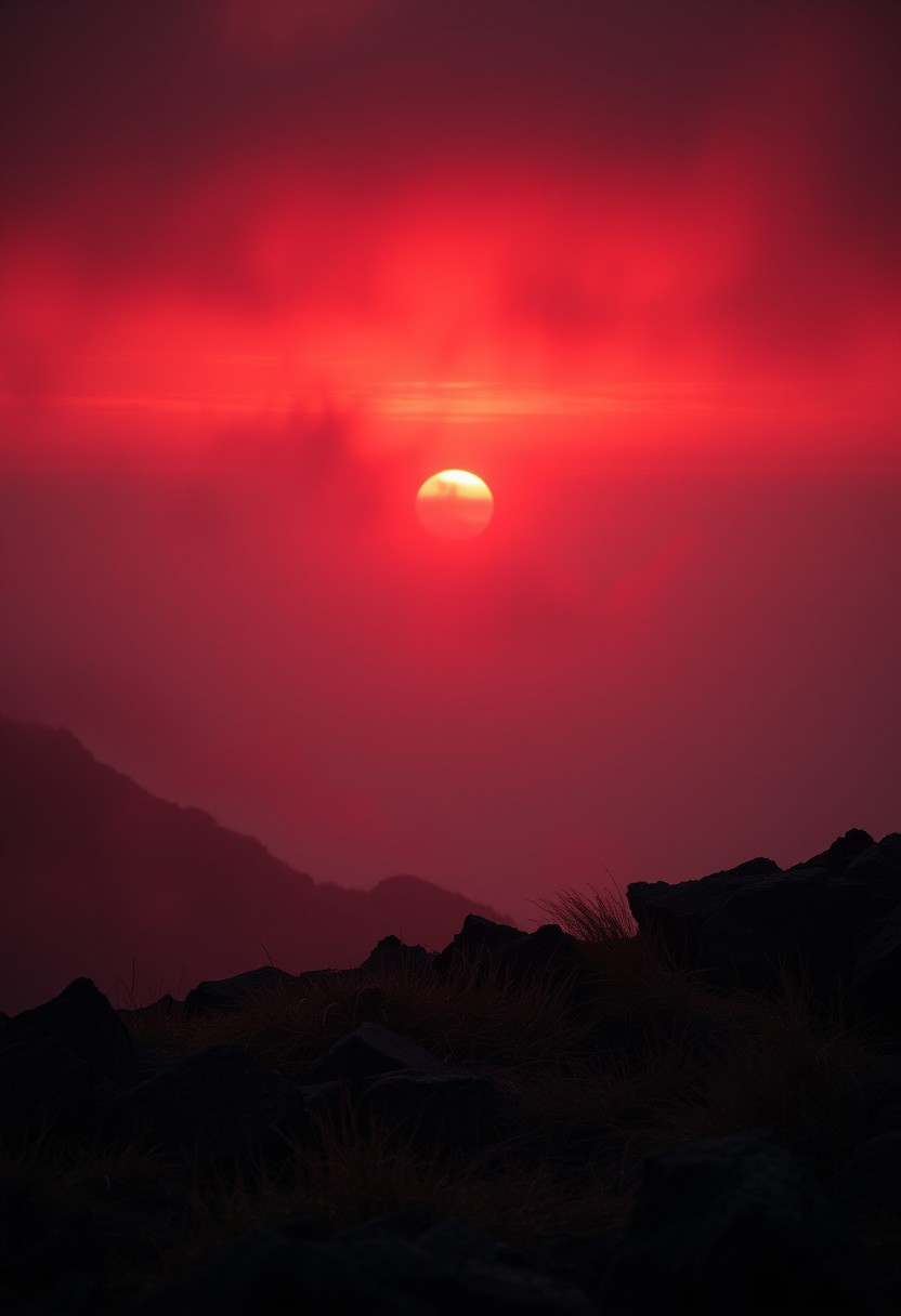 A crimson-hued sunset descends upon a rugged terrain, where wispy clouds and misty fog envelop the landscape in an eerie atmosphere. A dark, muted palette dominates, with deep oranges and purples bleeding into the distant haze. Cinematic lighting casts long shadows, imbuing the scene with dramatic tension. The camera pans across the terrain, capturing every nuance of fine detail, from the wispy grasses to the weathered rocks. A masterpiece of composition and atmospheric mastery, this breathtaking image demands attention.