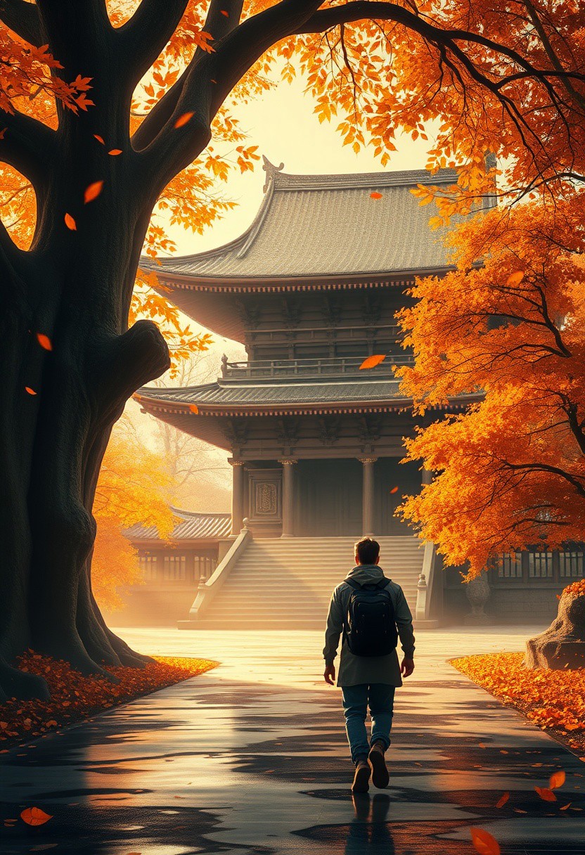 A breathtaking digital painting of a contemplative traveler making their way towards a majestic, ancient Asian temple. Surrounded by a symphony of falling autumn leaves, the atmosphere is serene and peaceful, evoking a sense of quiet journey and the tranquility of autumn. The warm, golden light filters through the leaves, casting a soft glow over the scene. The temple, with its intricate wood and stone carvings, stands out against the vibrant, saturated autumnal colors. The wet ground reflects the surroundings, while a large, ancient tree dominates the left foreground, adding depth and a sense of motion. This captivating image is inspired by the beauty of Asian architecture and landscape painting styles, creating a truly cinematic and immersive experience