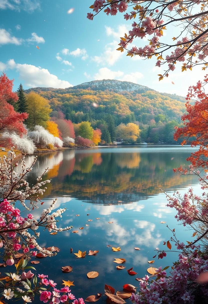A serene lake surrounded by a blend of all four seasons,with elements of fantasy and surrealism.The scene is vibrant and realistic,showcasing vivid colors of spring blooms,summer greenery,autumn leaves,and winter snow.Include ethereal lights and ,creating a dreamlike atmosphere.A serene lake reflecting the beauty of all four seasons-spring,summer,autumn,and winter-blended together in a fantasy setting.The scene is enchanting and surreal,with vibrant colors and realistic details that capture the essence of nature in a magical way.Include elements like blooming flowers in spring,falling cherry blossoms,lush greenery in summer,Flower snowstorms,colorful foliage in autumn,and a light dusting of snow in winter,all harmoniously combined.masterpiece,best quality,ultra detailed,8k portrait,highly detailed,highly detailed background,very detailed background