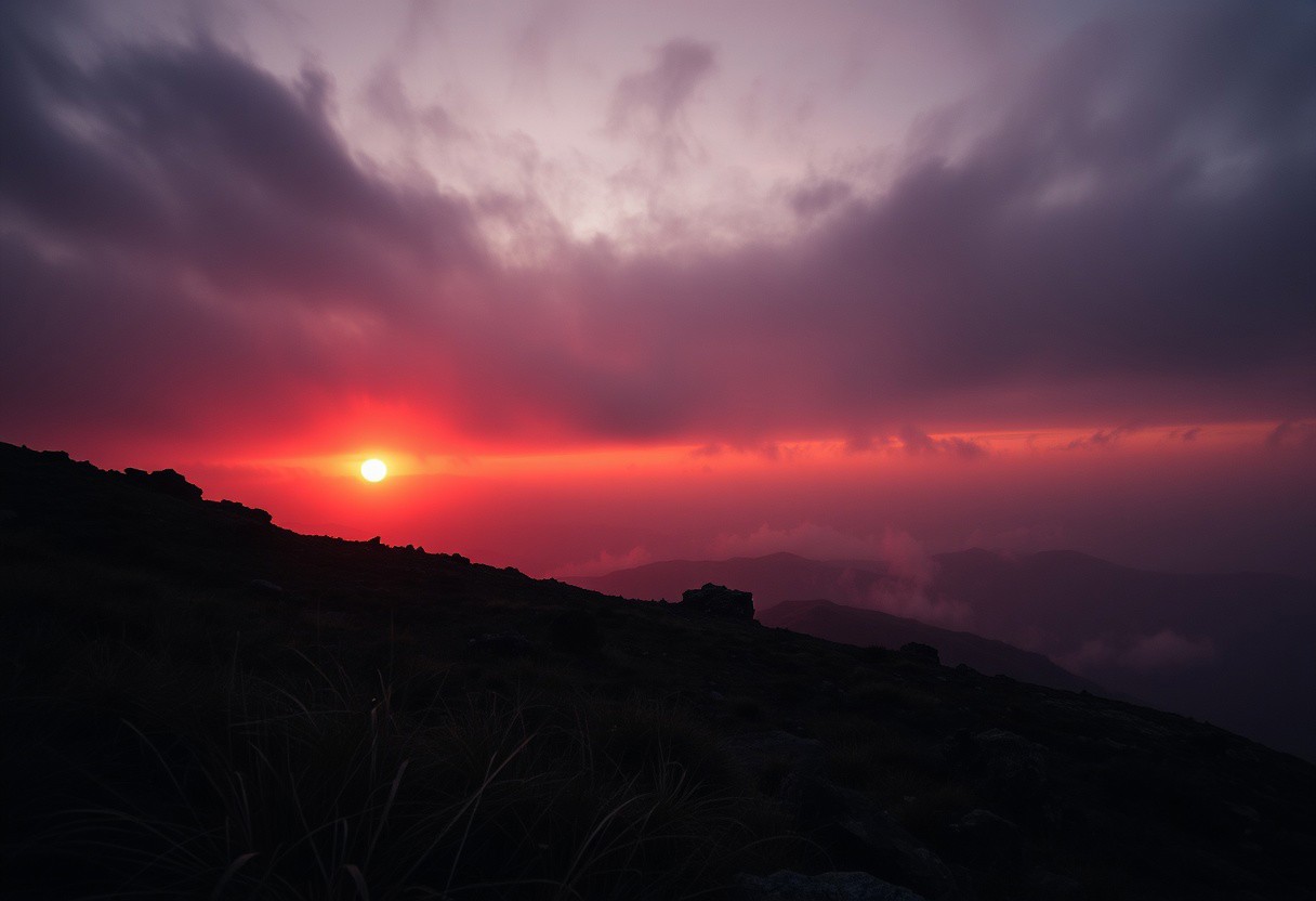 A crimson-hued sunset descends upon a rugged terrain, where wispy clouds and misty fog envelop the landscape in an eerie atmosphere. A dark, muted palette dominates, with deep oranges and purples bleeding into the distant haze. Cinematic lighting casts long shadows, imbuing the scene with dramatic tension. The camera pans across the terrain, capturing every nuance of fine detail, from the wispy grasses to the weathered rocks. A masterpiece of composition and atmospheric mastery, this breathtaking image demands attention.
