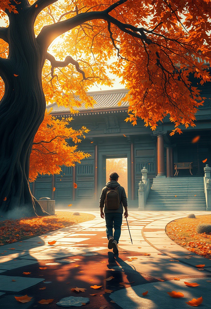 A breathtaking digital painting of a contemplative traveler making their way towards a majestic, ancient Asian temple. Surrounded by a symphony of falling autumn leaves, the atmosphere is serene and peaceful, evoking a sense of quiet journey and the tranquility of autumn. The warm, golden light filters through the leaves, casting a soft glow over the scene. The temple, with its intricate wood and stone carvings, stands out against the vibrant, saturated autumnal colors. The wet ground reflects the surroundings, while a large, ancient tree dominates the left foreground, adding depth and a sense of motion. This captivating image is inspired by the beauty of Asian architecture and landscape painting styles, creating a truly cinematic and immersive experience