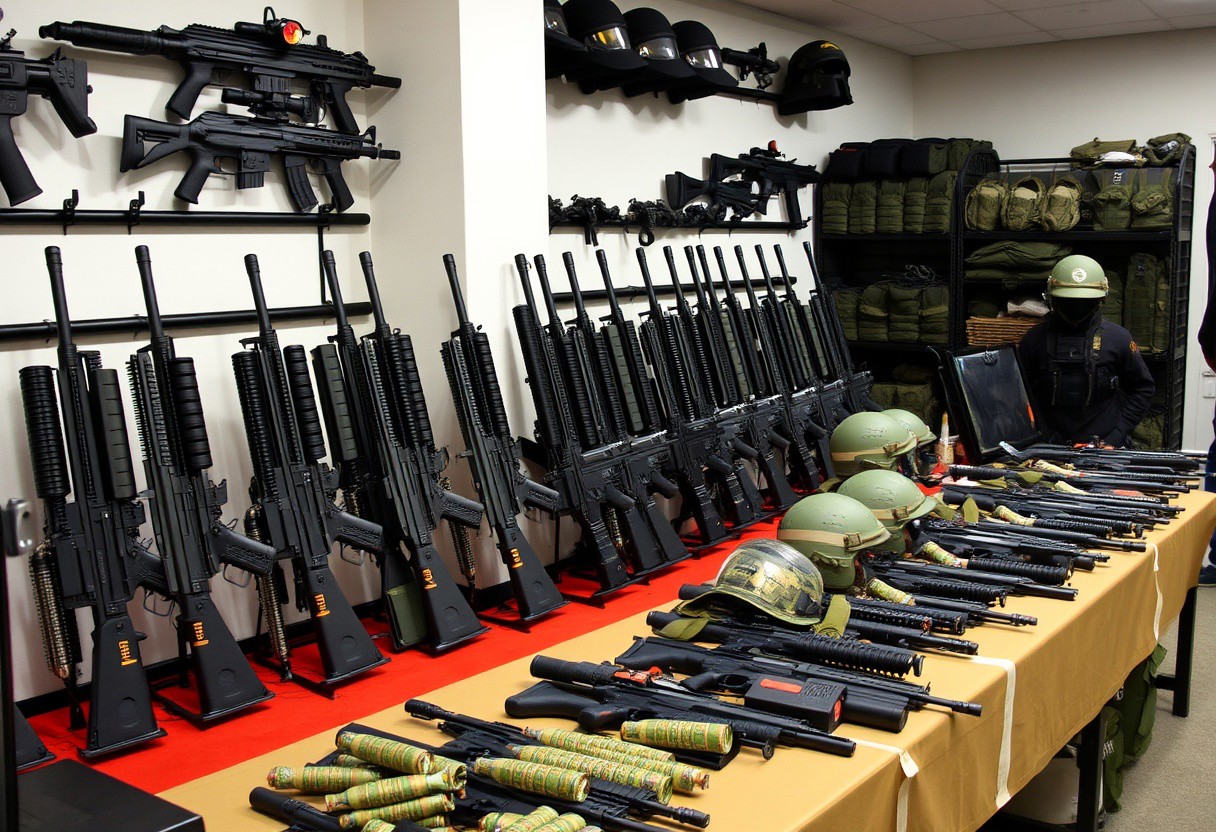 Weapon racks, Modern weapons, Guns, military equipment, Indoors, Weapons on tables, military setting, Bullet proof vests, grenades, helmets,