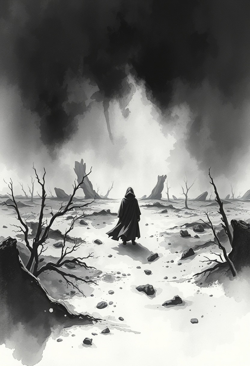 A classic black and white watercolor painting depicting a mysterious figure in a dark, overpopulated wasteland, dramatically lit and with intense detail. The barren landscape evokes an apocalyptic atmosphere through its delicate, translucent washes and fluid brushstrokes. The scene blends beauty and darkness.