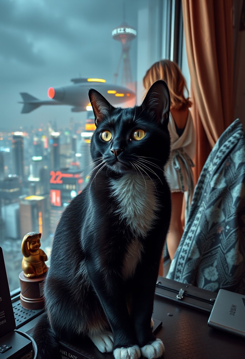 close up of the face of black cat with a white neck and white feet is sits on a cluttered metal riveted desk next to a maneki neko statue and small bronze buddha, the cat is looking out to a floor to ceiling window that looks out over a futuristic cyberpunk Tokyo skyline with skyscrapers and futuristic airships covered with lights and advertisements in Japanese, a beautiful young woman, 22 years old, is visible standing behind the cat looking out at the city. The woman is dressed in a short japanese style short robe loosely tied, exposing her long legs and copper tanned skin. The woman's hair is messy from just waking up. Close up of the woman and cat next to the window with half the image being the skyline and the other half being the apartment.