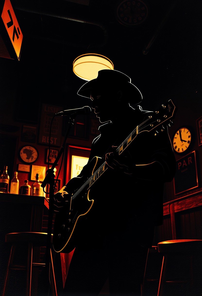 A high-angle perspective illustration using layered papier-mâché material and silhouetted backlighting. The subject is Robert Johnson in a gritty Alabama bar. The style is contemporary, with sculpted textured layers and a focus on the light source behind the subject, creating a dramatic effect.