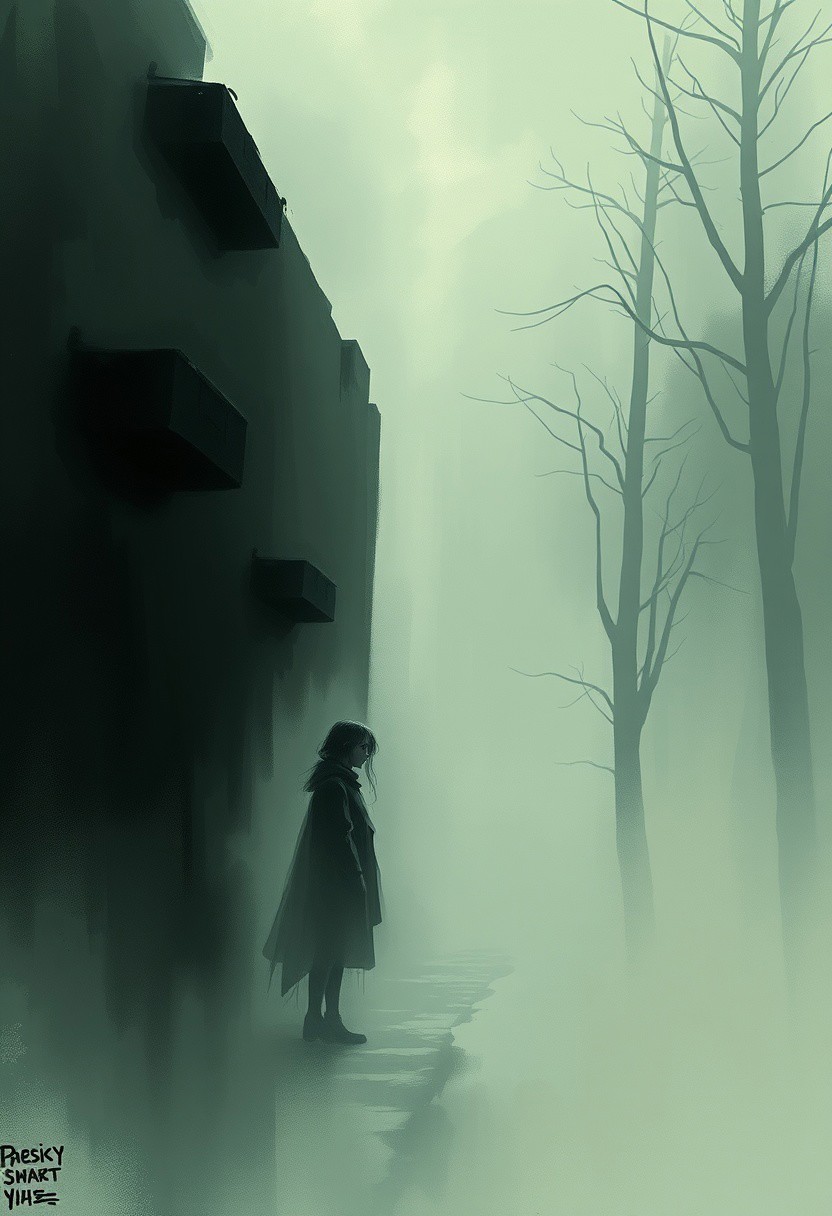 A dynamic digital sketch using loose painterly strokes depicts a lady waiting in thick foggy surroundings. The scene uses complementary epic colors, misty atmospheric effects, and focuses on rich textures. It's a surrealist depiction with Soviet-era motifs, muted palette, dreamlike distortions, and enigmatic figures, maintaining an unfinished concept-art style.