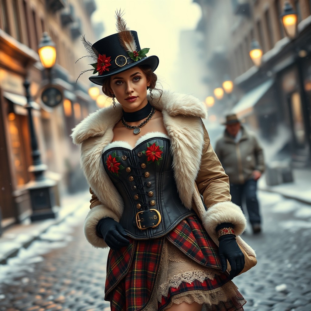 A steampunk-inspired Christmas outfit featuring a corset with metallic gears and poinsettia embroidery, paired with a puffy winter jacket trimmed with white fur. The skirt is layered with plaid fabric and lace, and the model wears a top hat adorned with holly and feathers. The background is a snowy Victorian street with glowing gas lamps and steam rising from the cobblestones. Keywords: steampunk, corset, poinsettia, puffy winter jacket, plaid, lace, top hat, holly
