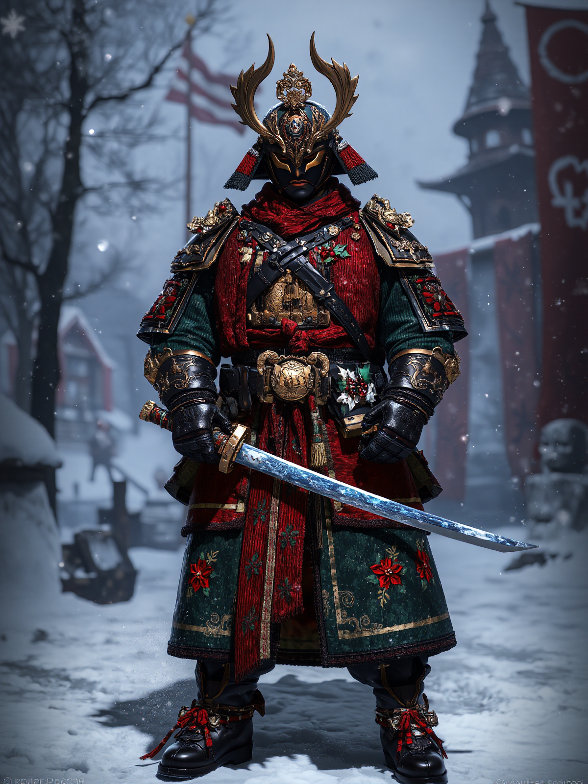 A noble samurai dressed in a deep green and red armor set, with poinsettia and holly leaf engravings on the shoulder plates. The chest armor glitters with gold accents, while a long, flowing scarf of red and white stripes drapes around the waist. The helmet features a dramatic crest of glowing snowflakes, and the katana blade glows faintly with icy blue energy. They stand on a snowy battlefield under falling snowflakes