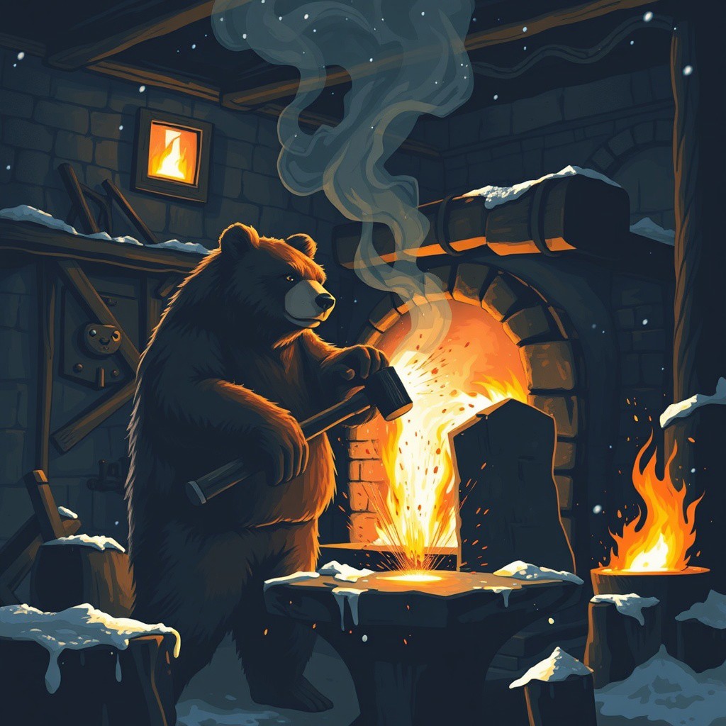 In Bear City, the forge burns bright, A blacksmith's hammer in the night. Steel meets stone with every strike, Forging weapons, fire and light. Paws calloused, muscles strong, Each swing a rhythm, fierce and long. Sparks fly in the winter air, As the city hums a tale of care. Anvil’s echo, a song of might, In Bear City’s heart, the flames ignite.