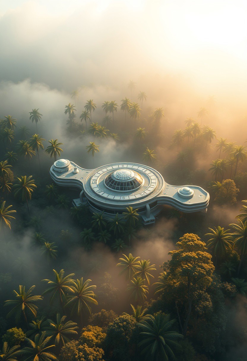 aerial view, a futuristic research complex in a bright foggy jungle, hard lighting
